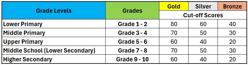 - Certificates and medals (for India) to participants with Gold, Silver and Bronze awards to students achaieving the minimum cut-off scores as shown in the table below. Remaining students to get merit e-certificates.